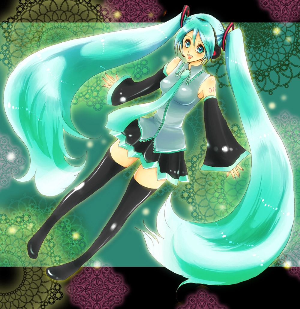 aqua eyesaqua hairdetached sleevesheadsetlong hairnecktieskirtsolothighhighstwintailsvery long hair
