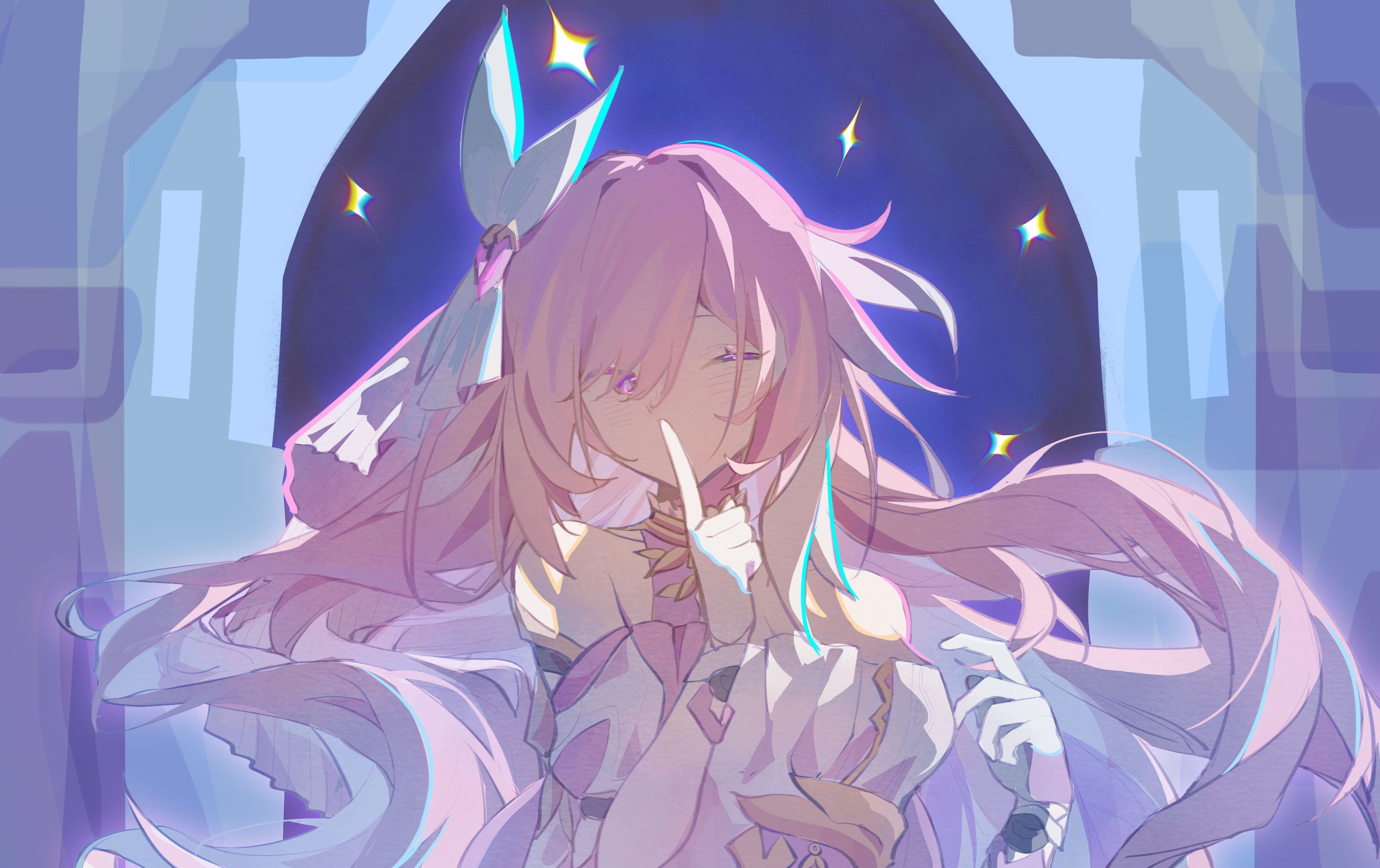 1boy1girlbare shouldersbreastscorsetdiamond (shape)diamond-shaped pupilsfinger to mouthgloveshair ornamentlarge breastslong hairlooking at viewerone eye closedpink hairpurple eyesshushingsmilesolosymbol-shaped pupilsvery long hairwhite corsetwhite gloves