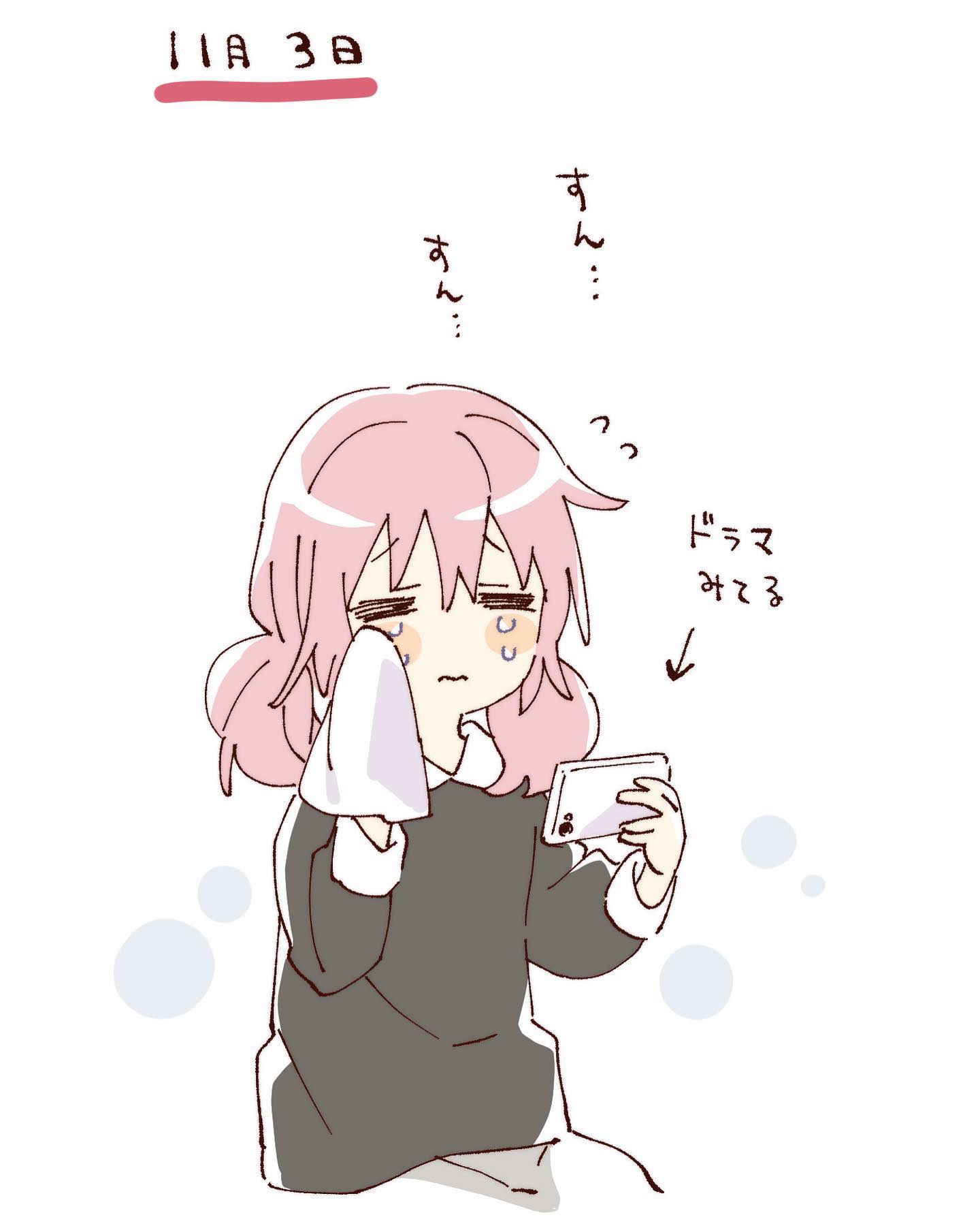 1girlblack shirtblush stickersclosed eyesclosed mouthcollared shirtcontrast collarcropped legscryingflying sweatdropslong hairlong sleeveslow twintailspink hairshirtsimple backgroundsittingsolotearstwintailswhite backgroundwiping tears