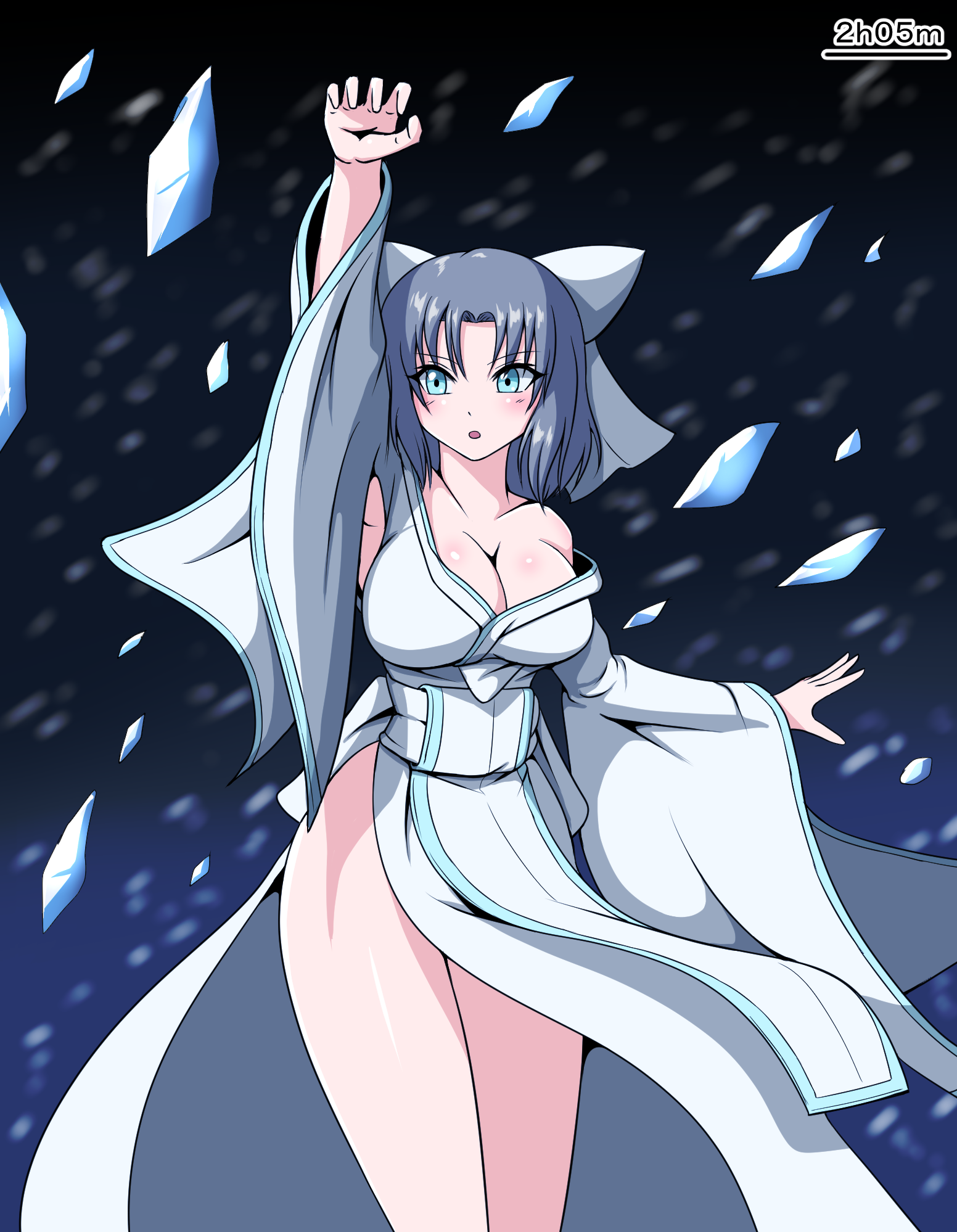 1girlarm uparmpitsblue eyesblushbreastscleavagecollarbonegrey hairhair ribbonice crystaljapanese clotheskimonolarge breastsmedium hairoff shoulderoutdoorsribbonsnowingsolothighswhite kimonowhite ribbon