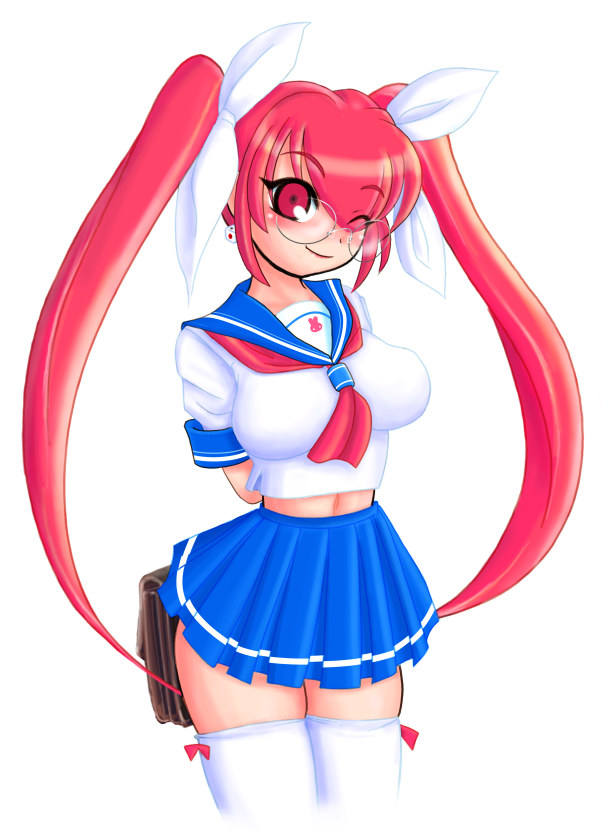 breastsglasseshair ribbonlarge breastsmidriffminiskirtred eyesred hairribbonsailorschool uniformskirtthighhighstwintailswink