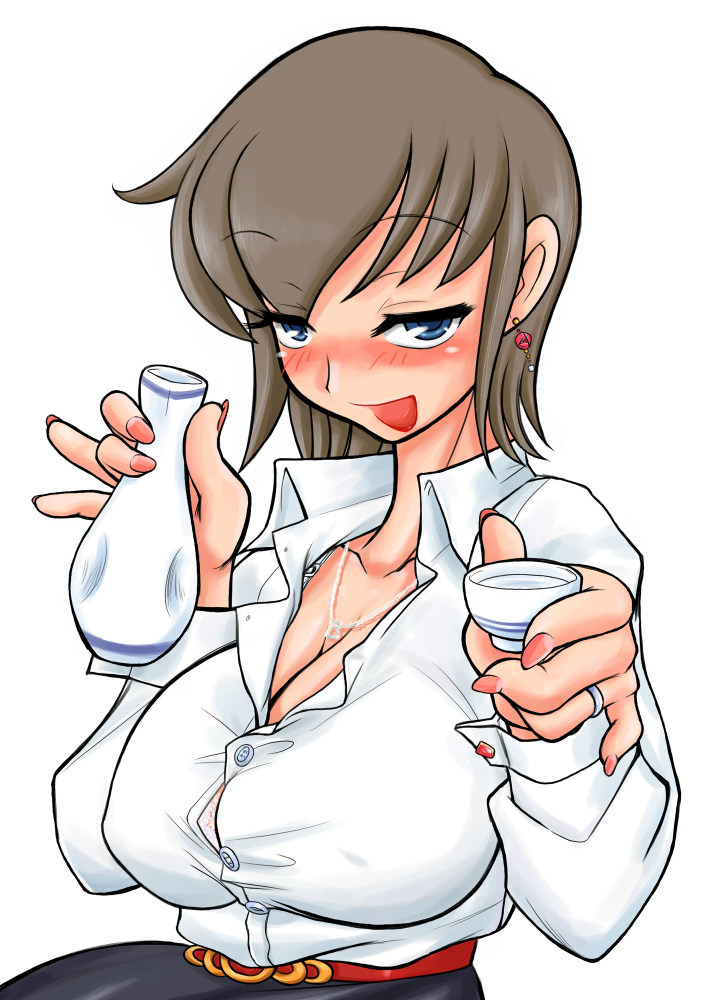 alcoholblue eyesblushbra strapbreastsbrown haircleavagedrunkearringsjewelrylarge breastsnail polishnecklaceopen collaropen mouthreligious offeringringsakewedding ring