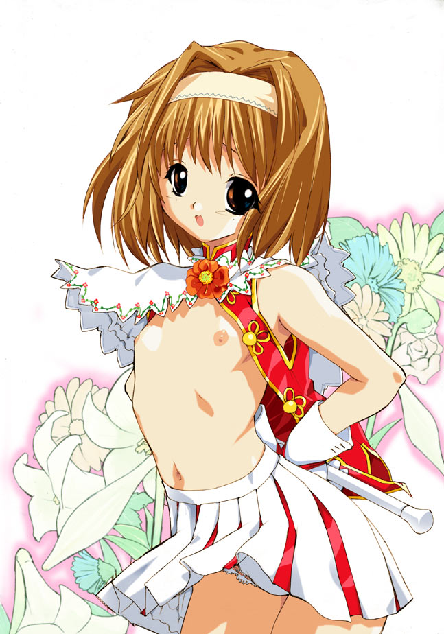 1girlbrown eyescheerleaderflat chestflowergloveshairbandlolinipplesopen clothesopen shirtpantiesshirtskirtskirt flipunderwear