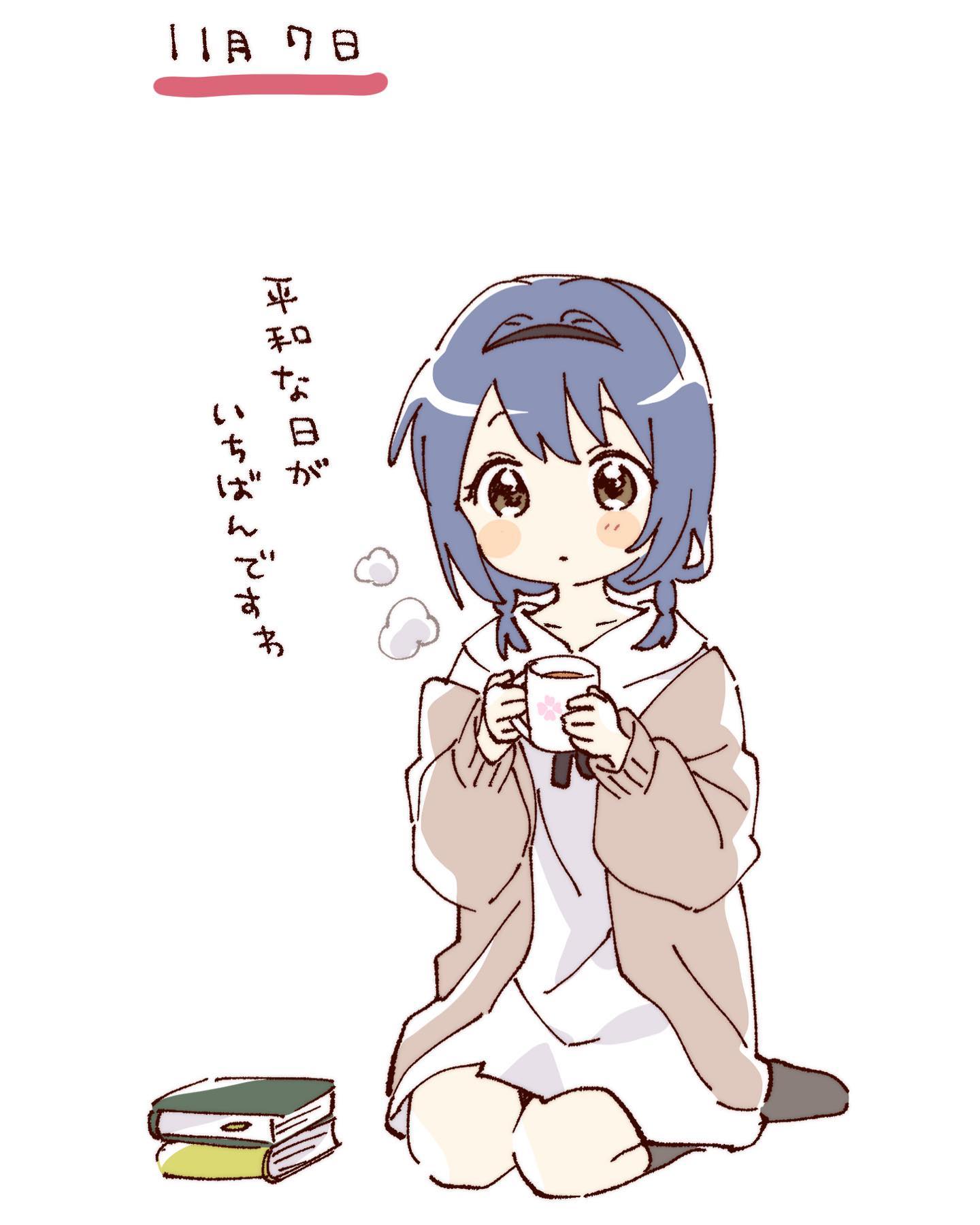 1girlblack hairbandblack socksblue hairblush stickersbookbook stackbraidbrown eyesbrown jacketclosed mouthcupdressfull bodyhairbandholdingholding cupjacketlong sleevesmugno shoesoff shoulderopen clothesopen jacketshort hairsimple backgroundsittingsockssolotwin braidswhite backgroundwhite dress