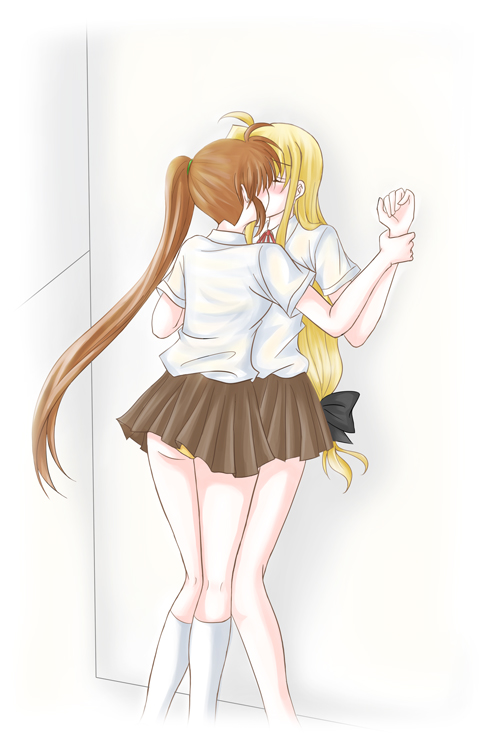 00s2girlsagainst wallahogeblonde hairblushbowbrown hairhair bowkisslong hairmultiple girlspantiespantyshotrestrainedschool uniformside ponytailskirtunderwearvery long hairyellow pantiesyuri