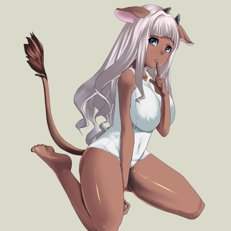 1girlanimal earsbarefootblue eyesbreastscovered erect nipplescow earscow girldark skindark-skinned femalefemale focusgrey hairhornshuge breastskneelinglong hairone-piece swimsuitpantiesschool swimsuitsoloswimsuittailunderwearwhite hairwhite one-piece swimsuitwhite school swimsuit