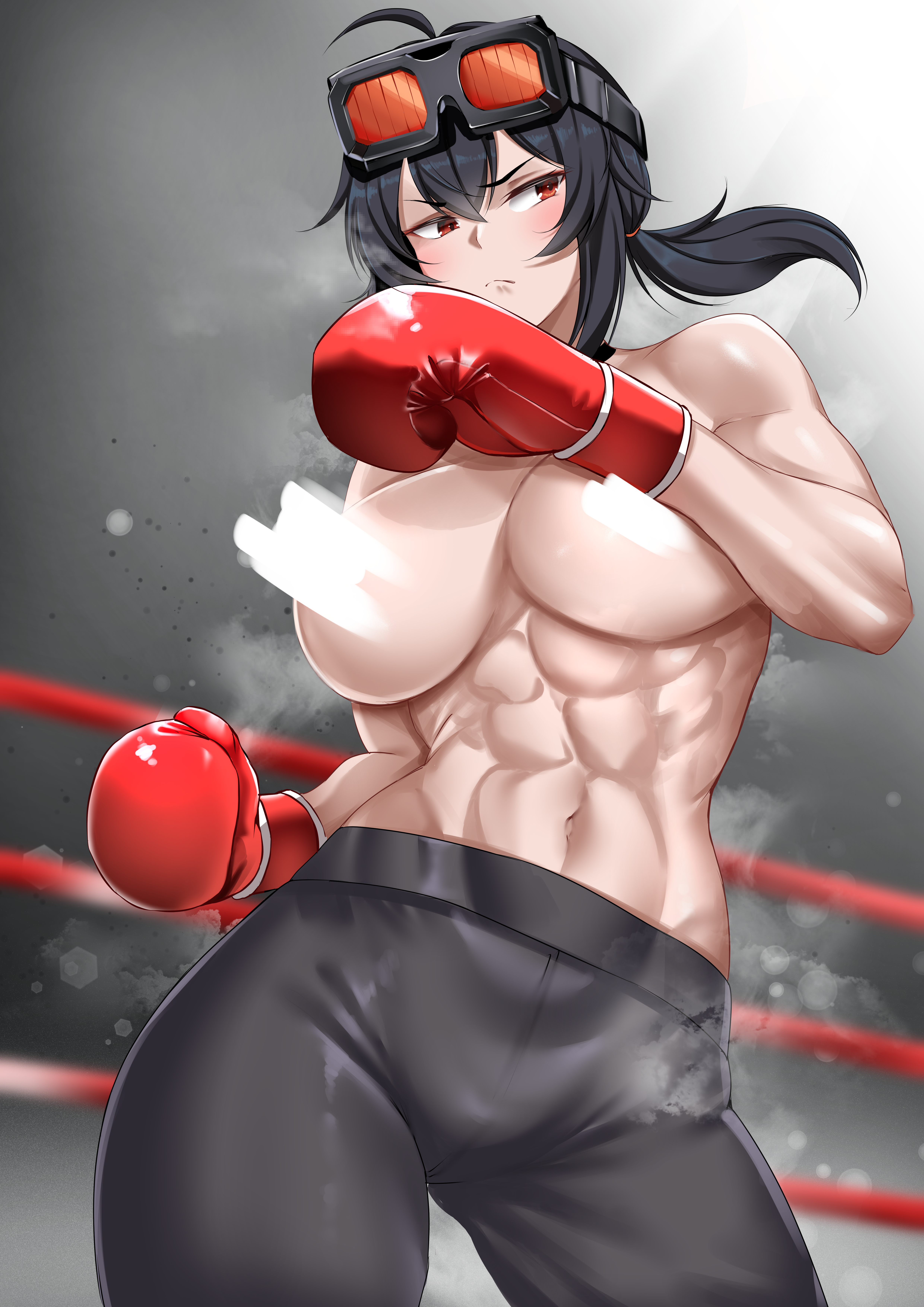 1girlabsahogebare shouldersblack hairblack pantsblank censorboxingboxing glovesboxing ringbreastscensoredcensored nipplesclosed mouthfacing viewergogglesgoggles on headgrey backgroundhair between eyeslarge breastslooking to the sidemuscularmuscular femalenavelpantsponytailred eyessolosteamsteaming bodystomach
