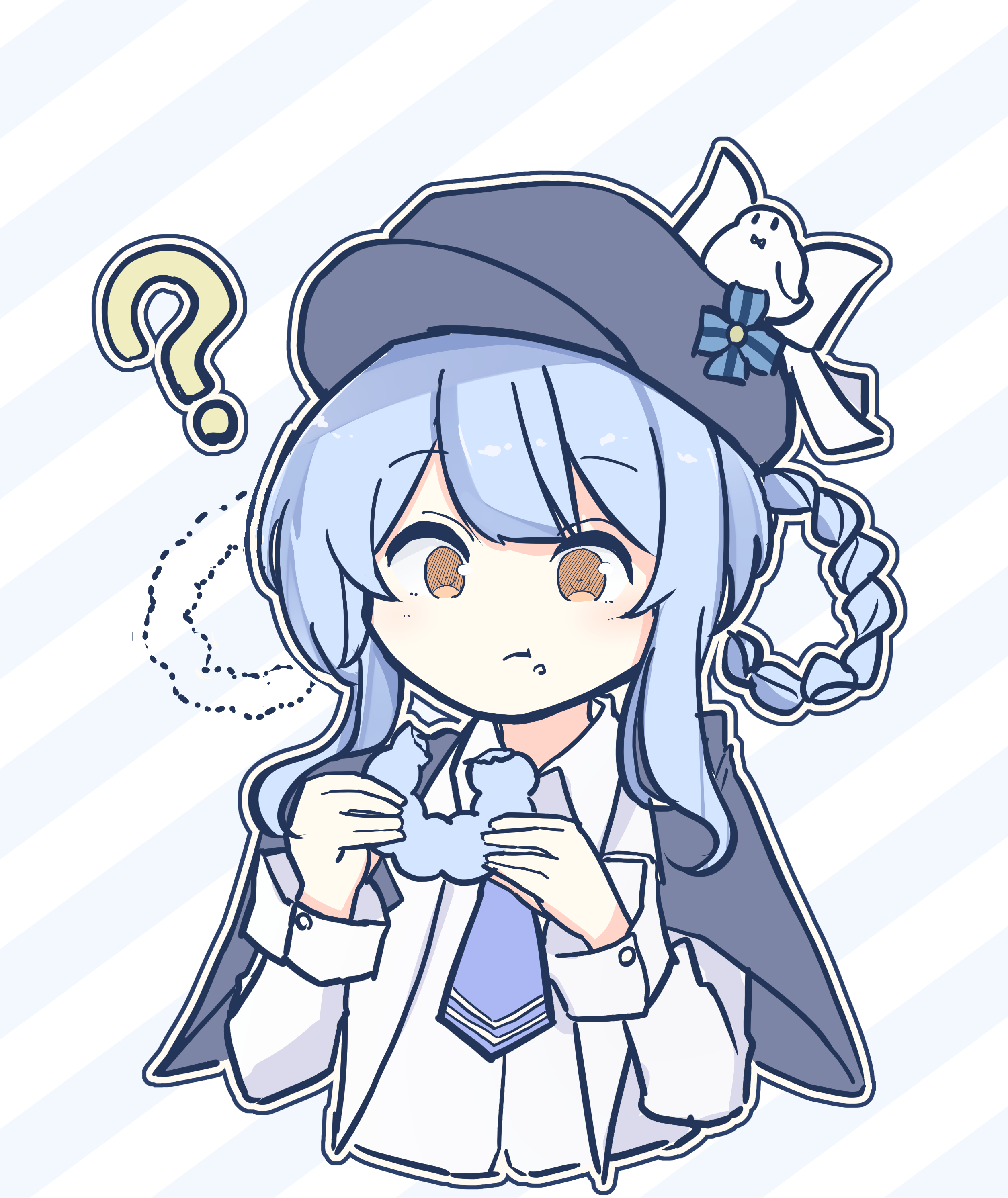 1boy1girlbird hat ornamentblack capeletblue hairblue necktiebraidbraided hair ringscapeletdeerstalkerdonuteatingfoodhair ringshatmagical girlnecktiepon de ringshirtshort hairsimple backgroundsolostriped backgroundtwo-tone backgroundwhite shirtyellow eyes