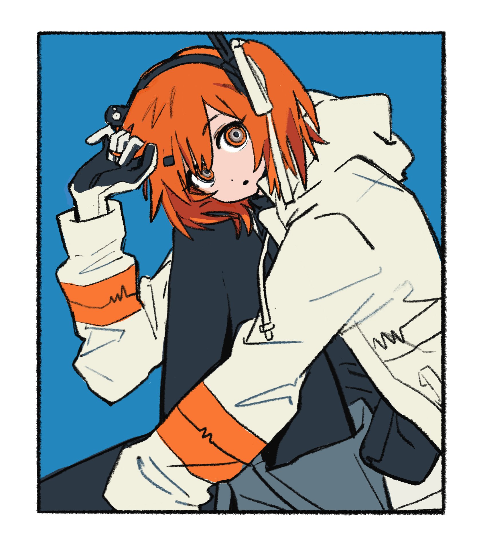 1girlblue backgroundbordergloveshair ribbonhand upheadphonesholdingholding own hairhoodhood downhooded jackethugging own legjacketknee uplong sleeveslooking to the sideone side uporange eyesorange hairpantyhoseparted lipsribbonringed eyesshort hairsittingskirtsolowhite border
