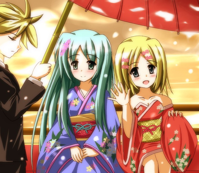 1boy2girlsholdingholding umbrellajapanese clotheskimonomultiple girlsoil-paper umbrellasittingsunumbrellawaving