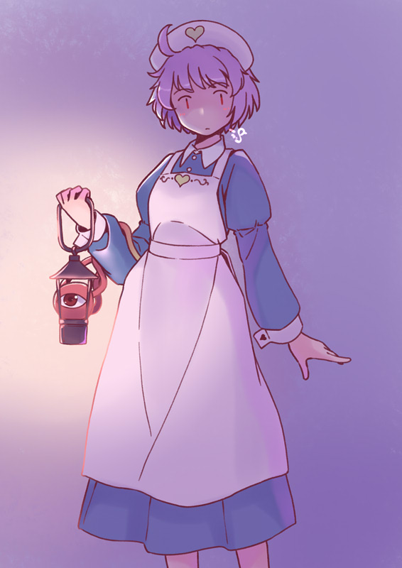 1boy1girlalternate costumeapronblue dresscollared dressdressfeet out of framehatheartheart printholdingholding lanternjuliet sleeveslanternlight blushlight frownlong sleevesnursenurse cappuffy sleevespurple backgroundpurple hairred eyesshort hairsolothird eyewhite apronwhite hat