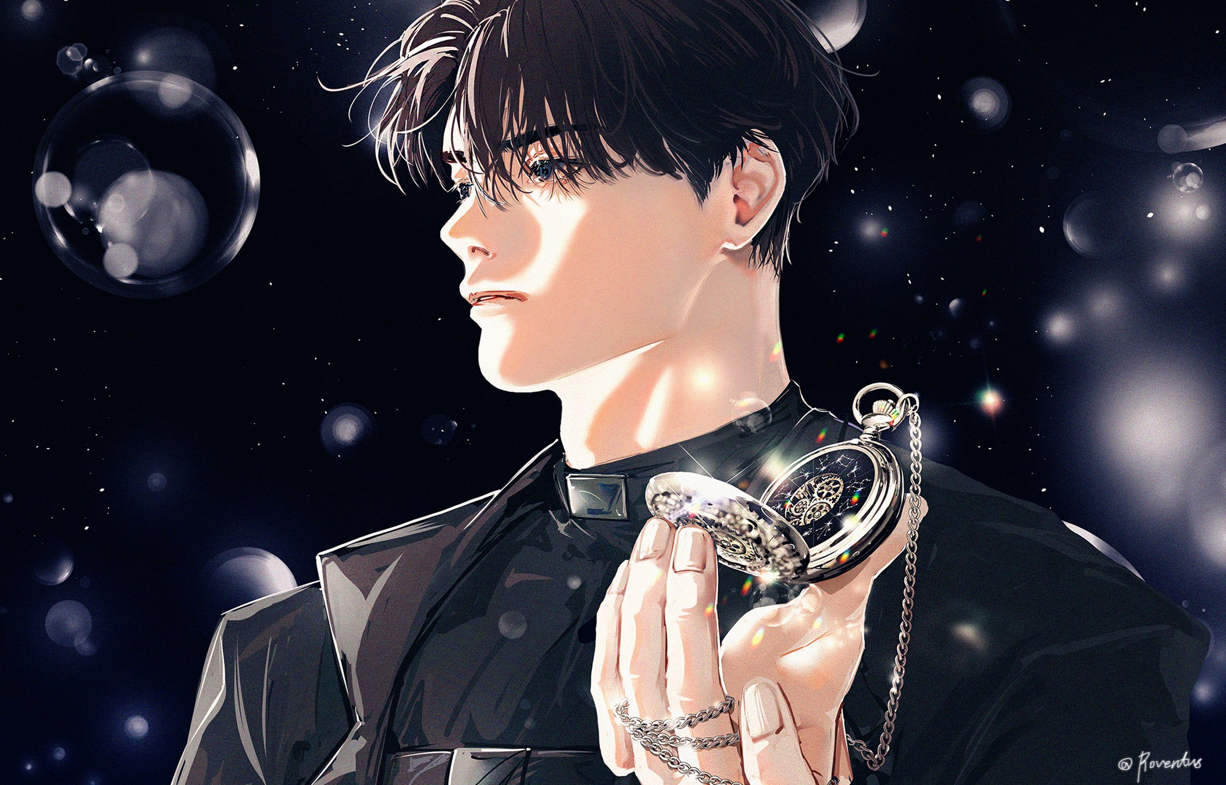 1boybeltblack coatblack eyesblack hairblurryblurry foregroundbubblecoatcrew neckhand upholdingholding pocket watchmale focusmotion bluropen clothesopen coatparted lipspocket watchpopped collarroventusseriousshort hairskysolospacestar (sky)starry skyupper bodywatch