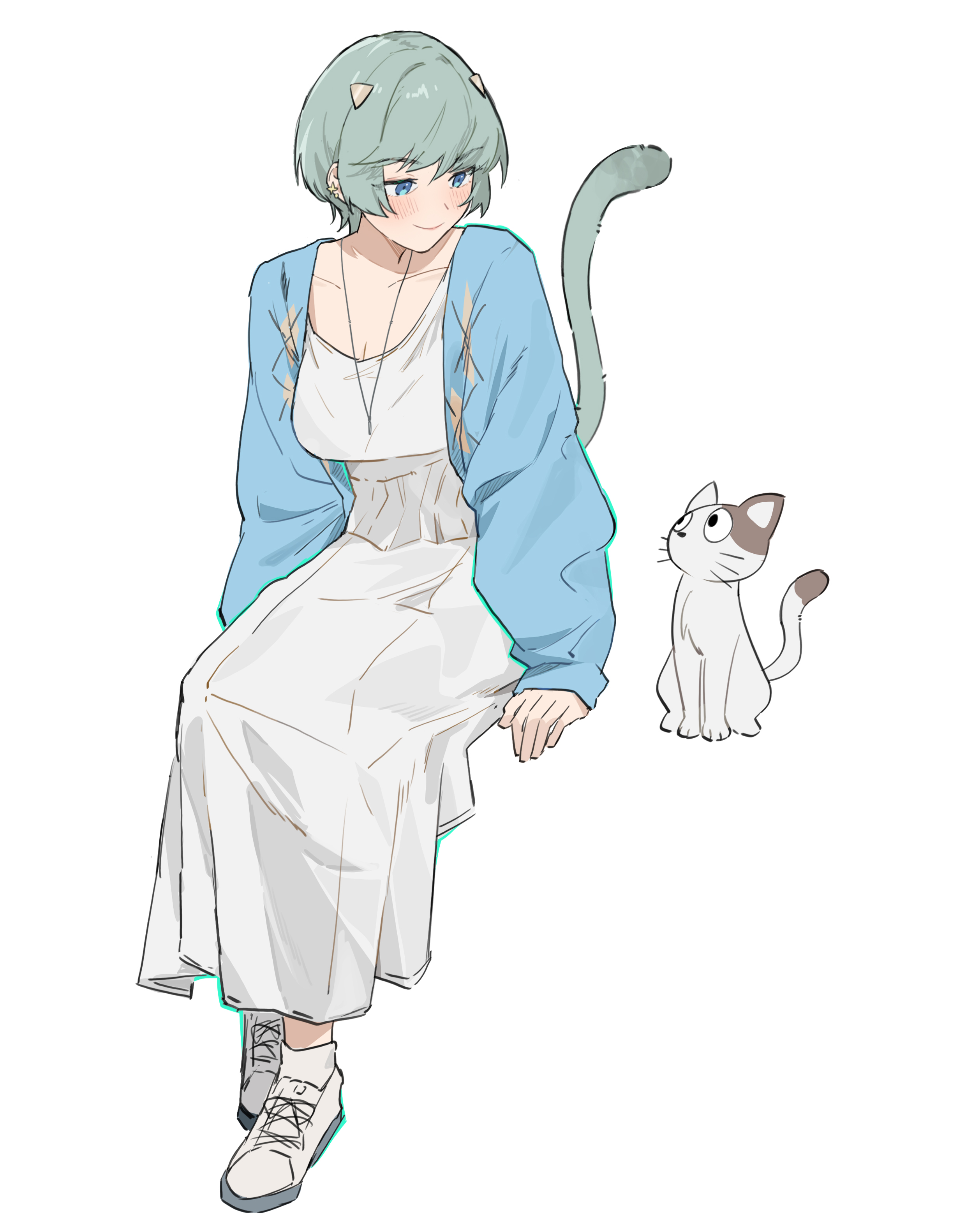 1girlblue cardiganblue eyesblue hairbreastscardigancatcat girlcat tailcleavageclosed mouthdressear piercingfull bodyhair ornamentjewelrylong sleeveslooking at animalmedium breastsnecklaceopen cardiganopen clothespiercingshoesshort hairsimple backgroundsittingsmilesoloswept bangstailtriangle hair ornamentwhite backgroundwhite dresswhite shoes