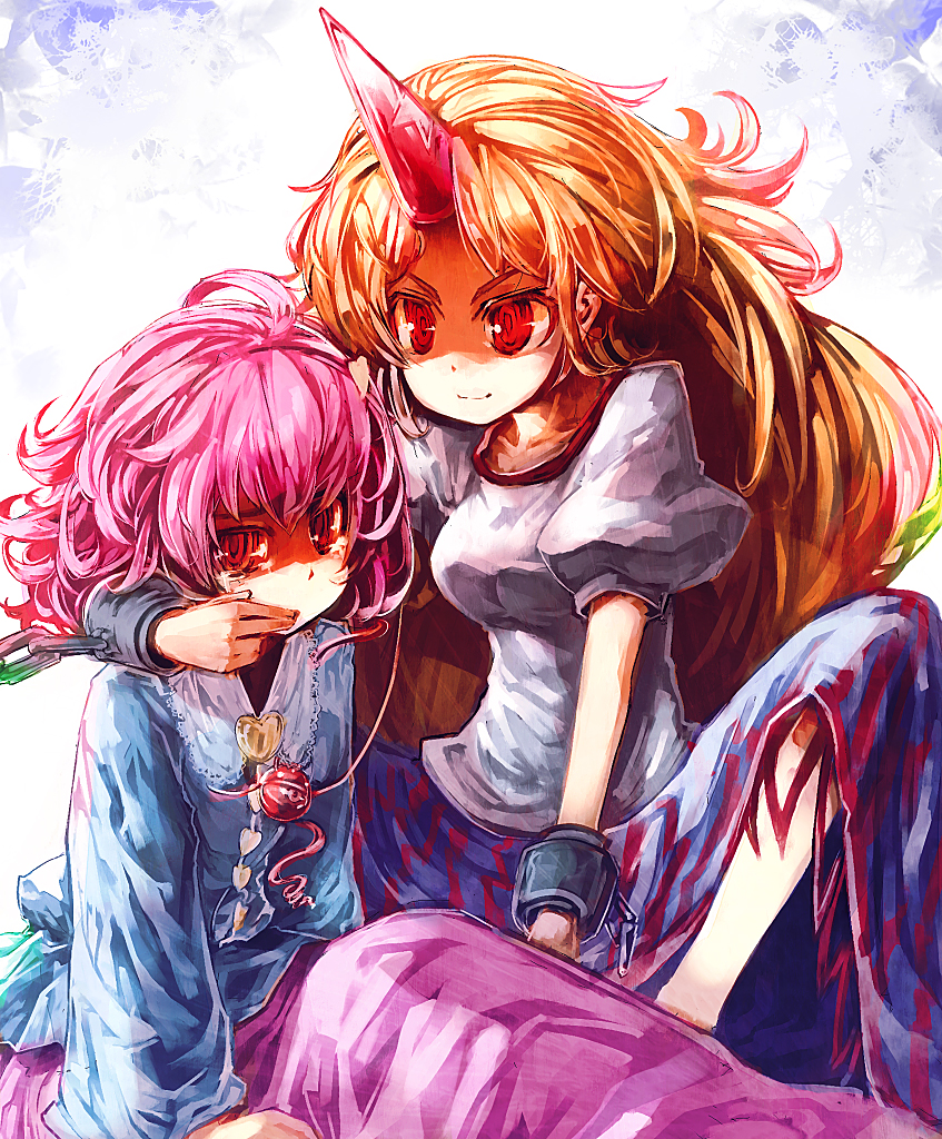 2girlsblonde hairchaincuffsfemale focushearthornslong hairmultiple girlspurple hairred eyesshort hairtears