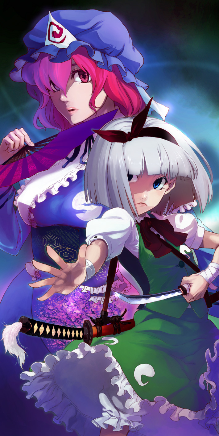 2girlsbandagesblue eyesfemale focusfrillsgrey hairhairbandhand fanhatjapanese clotheskatanalipslipstickmakeupmultiple girlsobipink eyespink hairsashswordweapon