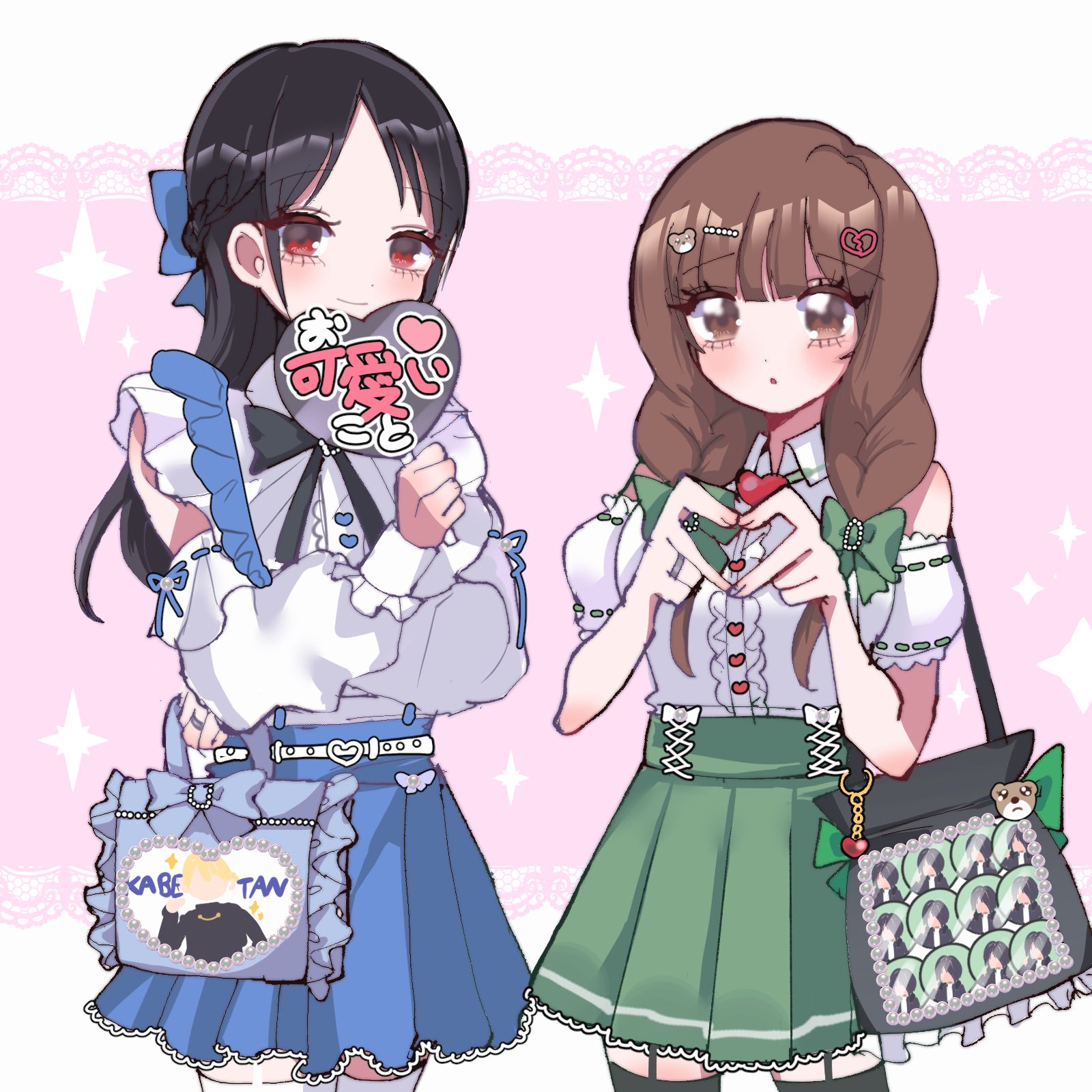 1girlarmbandbagblack hairblue skirtbrown eyesbrown hairgreen skirthandbaglow twintailsred eyesskirttwintailswhite background