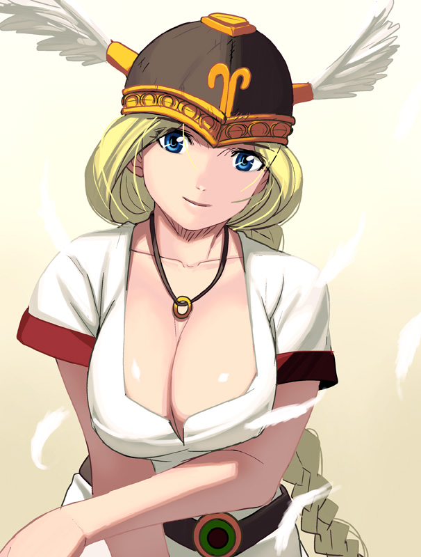 1girlblonde hairblue eyesbraidbreastscleavagefemale focushead wingshelmetjewelrylarge breastslong hairpendantsmilesolowinged helmetwings