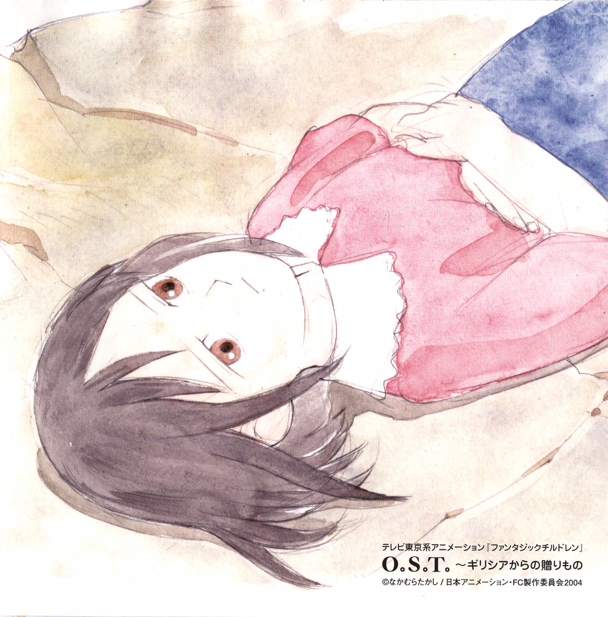 00s1girlblue dressbrown eyesbrown hairchilddressfemale focuslyingred shirtshirtshort hairsketchsolo