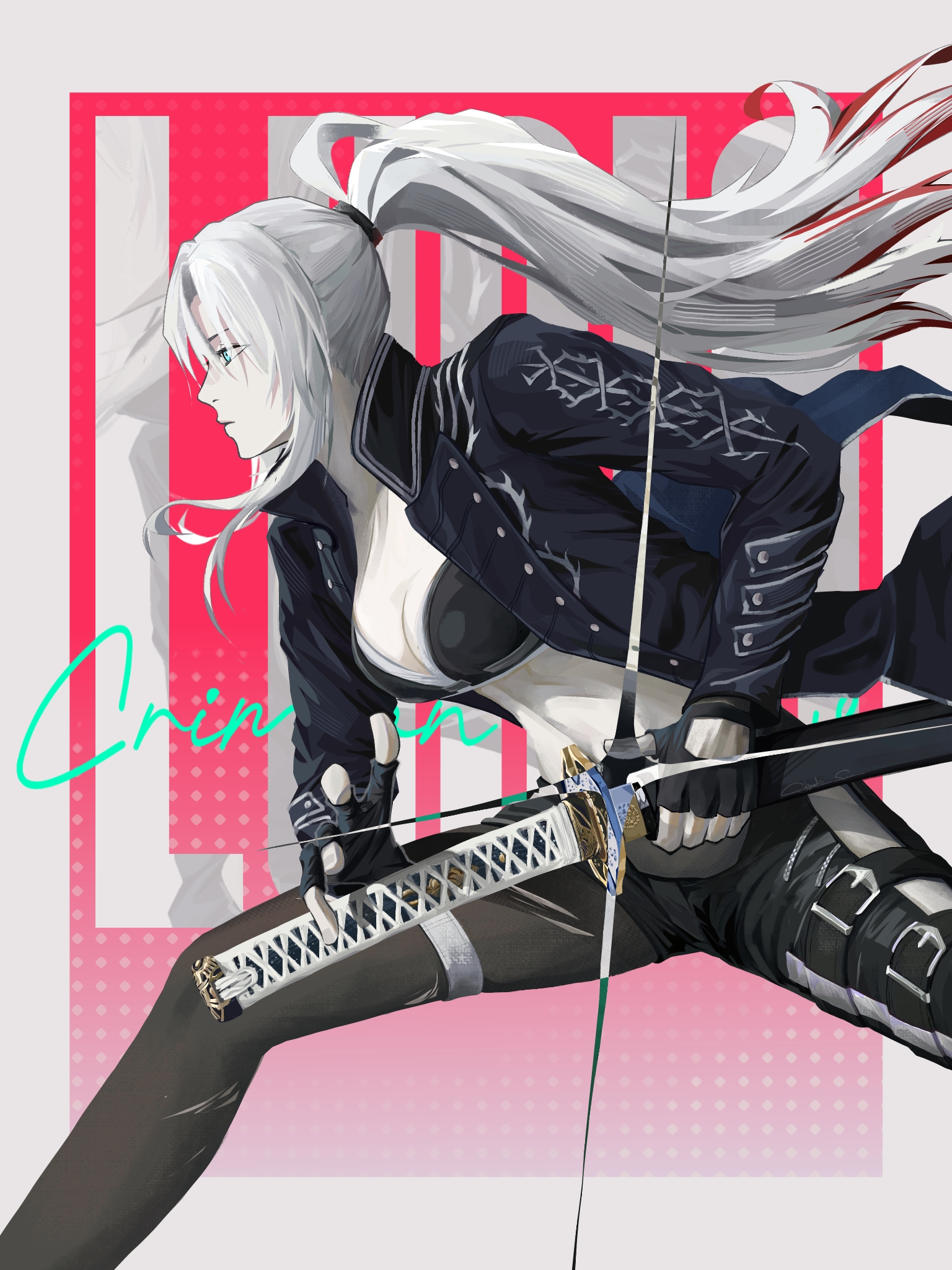 nasu (ilo a5), original, highres, unfinished, 1girl, black eyes, black hair, black pants, breasts, cigarette, clenched teeth, crossed legs, from above, grey shirt, holding, holding cigarette, large breasts, looking at viewer, muscular, muscular female, pants, parted lips, shirt, short hair, simple background, sitting, smoke, smoking, solo, teeth, white background