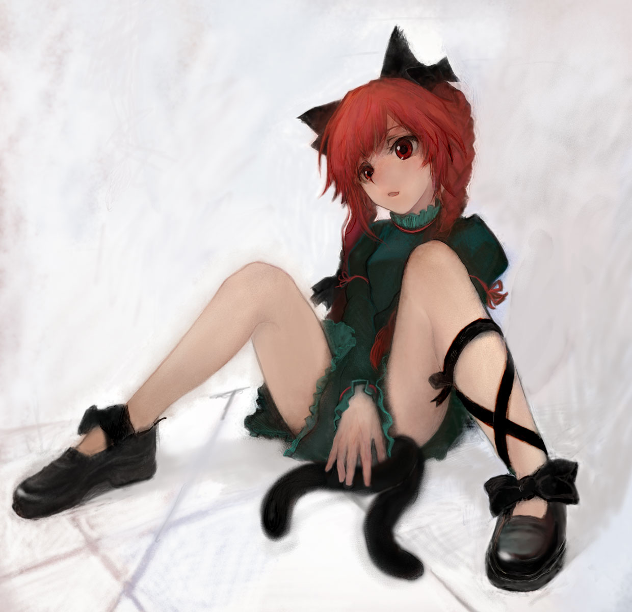 1girlanimal earsbraidcat earscat girlcat tailcovering crotchcovering privatesdressfangfemale focusleg ribbonlong hairmultiple tailsno socksopen mouthred eyesred hairribbonsolospread legstailtwin braidstwintails