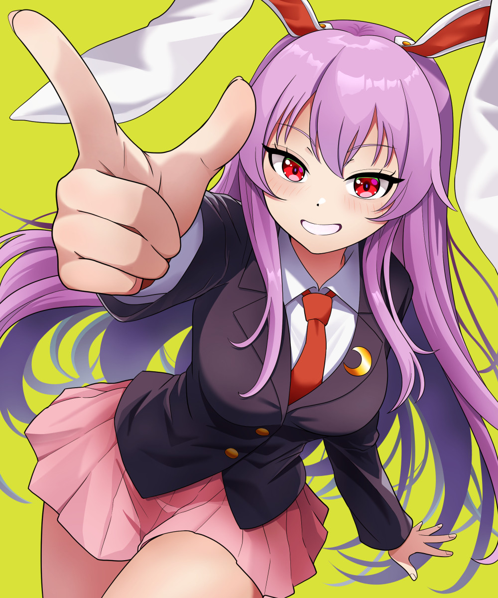 1girlanimal earsblack jacketblazerbreastscollared shirtcrescentcrescent pinfinger gungrinjacketlarge breastslong hairlong sleeveslooking at viewernecktieoutstretched armpink skirtpuffy short sleevespuffy sleevespurple hairrabbit earsred eyesred necktieshirtshort sleevessidelocksskirtsmilesolovery long hairwhite shirtyellow background