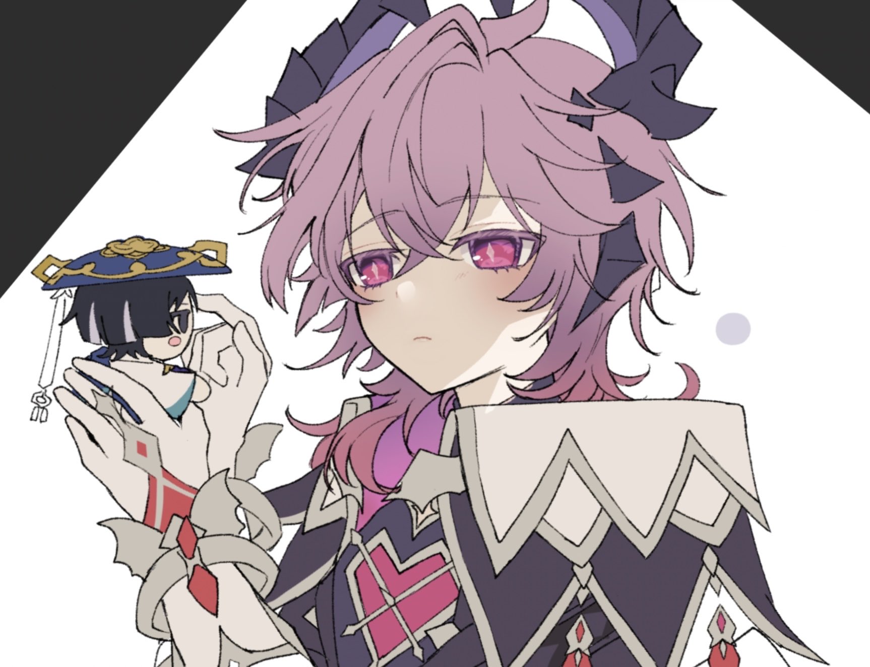 1boyblack coatblack hornsblushbraceletbright pupilscharacter dollchest jewelclosed mouthcoatcollarcolored eyelashescrossed bangsdiamond (shape)diamond-shaped pupilsdolldragon boygemgloveshair between eyeshands upheart-shaped gemholdingholding dollholding stuffed toyhornsjewelrylooking at objectmale focusopen clothesopen coatpink eyespink gemstonepink hairportraitpurple hornsred gemstonestuffed toysymbol-shaped pupilstwo-sided hornswhite backgroundwhite collarwhite gloveswhite pupilswing ornament