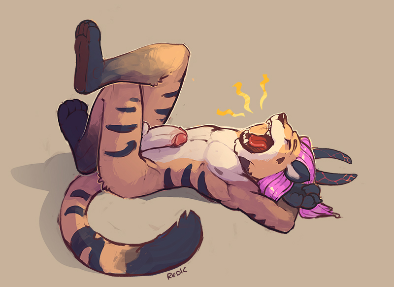 anthroarms behind headballsclosed eyescrossed legserectionfelineFlag for Deletionfurryhairhornhumanoid penislyingmalemale onlyno humansnudeon backopen mouthpenispink hairsolotiger