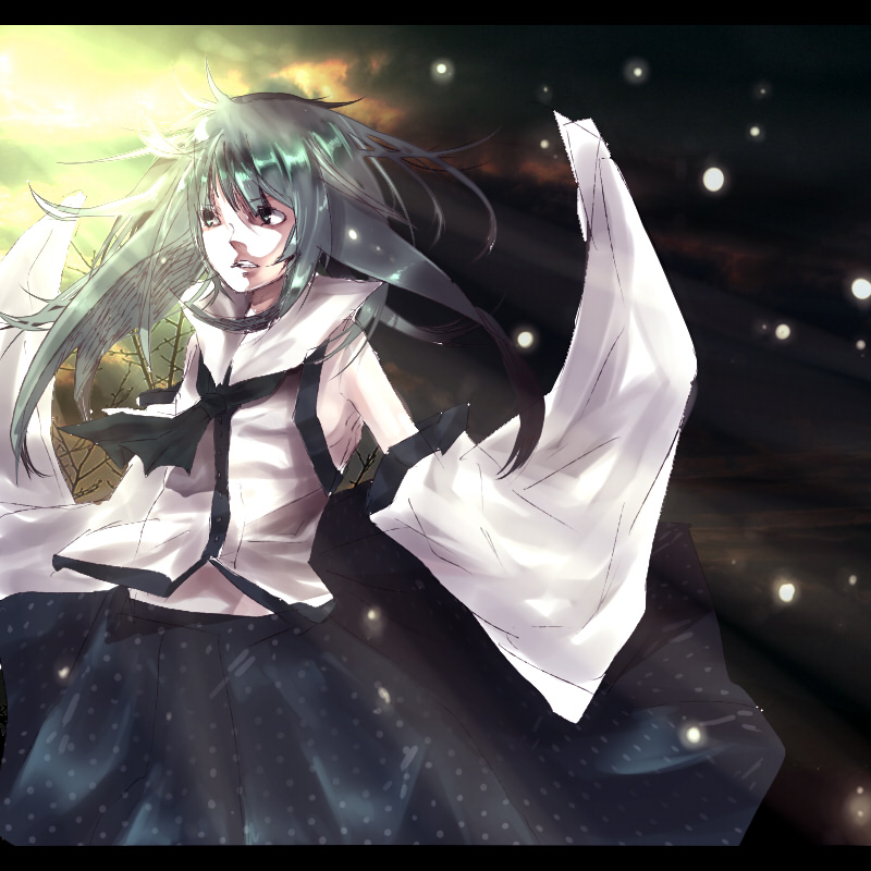 1girlarmpitsbare shouldersblue skirtbreastsbuttonsclenched teethcowboy shotdetached sleevesfemale focusgreen eyesgreen hairletterboxedlong hairmatching hair/eyesneckerchiefparted lipssideboobskirtsmall breastssoloteethvestwhite vest