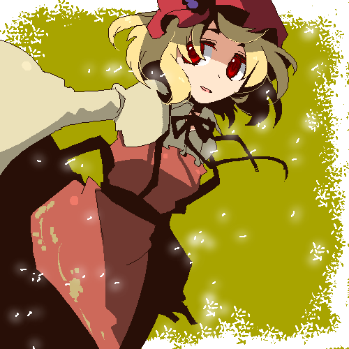 remilia scarlet, touhou, 1girl, ;o, bat wings, blush, capelet, female focus, hand to own mouth, oekaki, one eye closed, open mouth, orange background, purple hair, red eyes, short hair, sleepy, solo, tearing up, upper body, wings, wristband, yawning