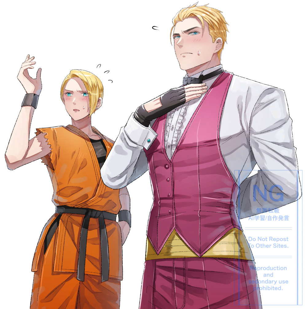 1boy1girlbeltblack beltblack bowblack bowtieblack glovesblonde hairblue eyesblushbowbowtiecollared shirtcosplaycostume switchcowboy shotcuff linksdougidress shirtearringsembarrassedgloveshair slicked backjewelryking (snk) (cosplay)long sleevesmartial arts beltorange dougipantspurple pantspurple vestryou sakazaki (cosplay)sashshirtshort hairsimple backgroundsweatdropundershirtvestwhite backgroundwhite shirtwristbandyellow sash