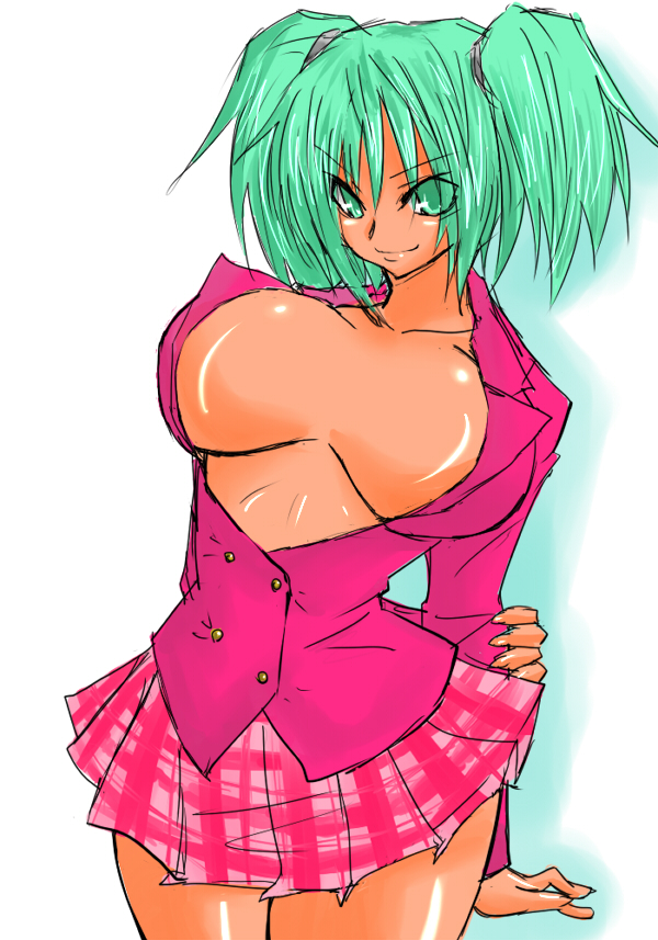 00s1girlbreastscleavagedark skindark-skinned femalefemale focusgreen eyesgreen hairhuge breastsno braopen clothesopen shirtshirtshort hairskirtsolotwintails