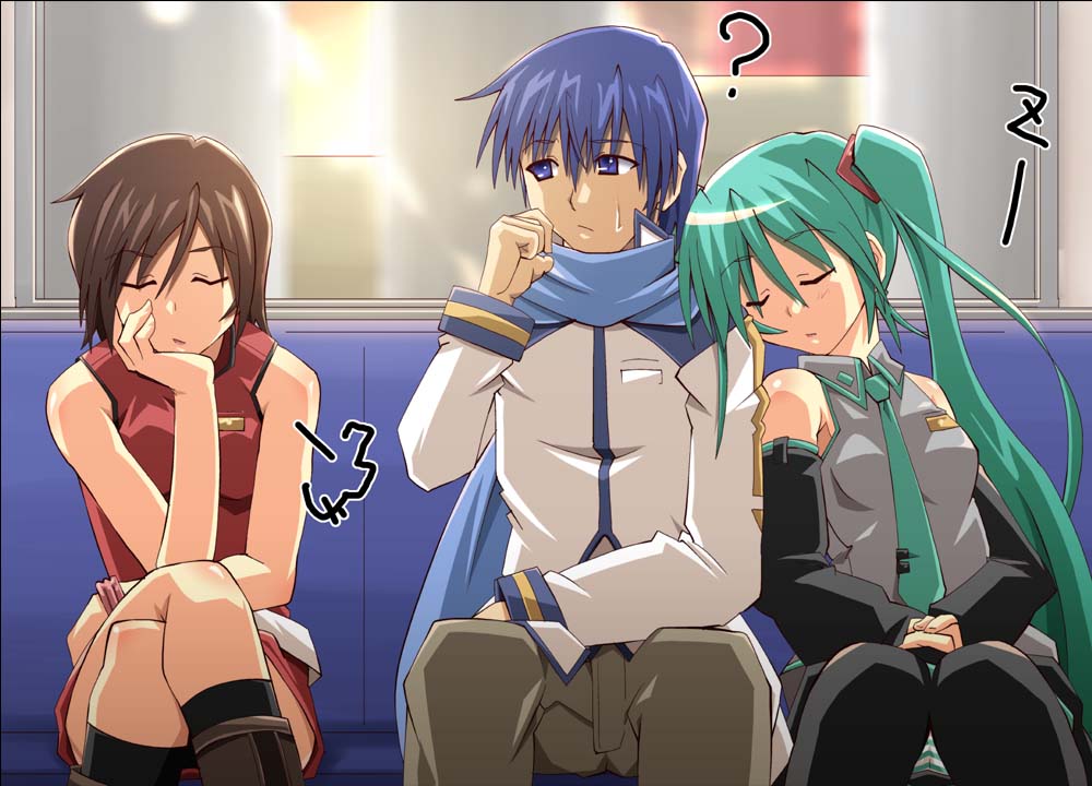 1boy2girlsaqua hairmultiple girlspantiespantyshotsittingsleepingsleeping uprightstriped clothesstriped pantiessweatdropthighhighstwintailsunderwear