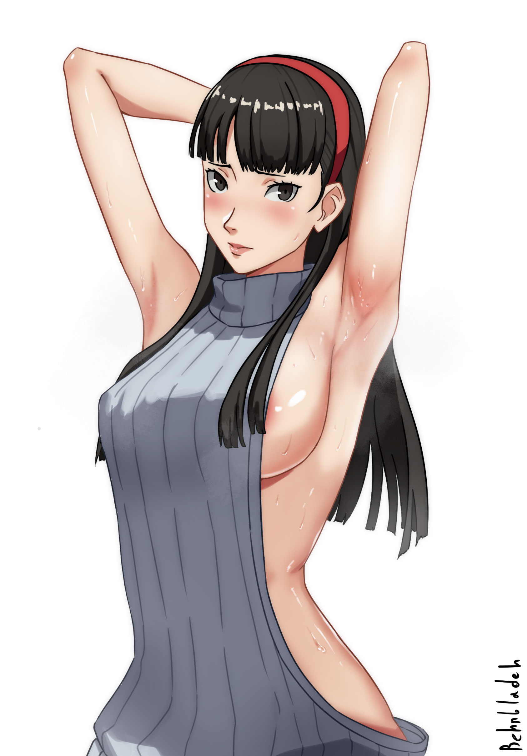 1girlareola sliparmpit focusarmpitsblack hairblushsimple backgroundsweatvirgin killer sweaterwhite background