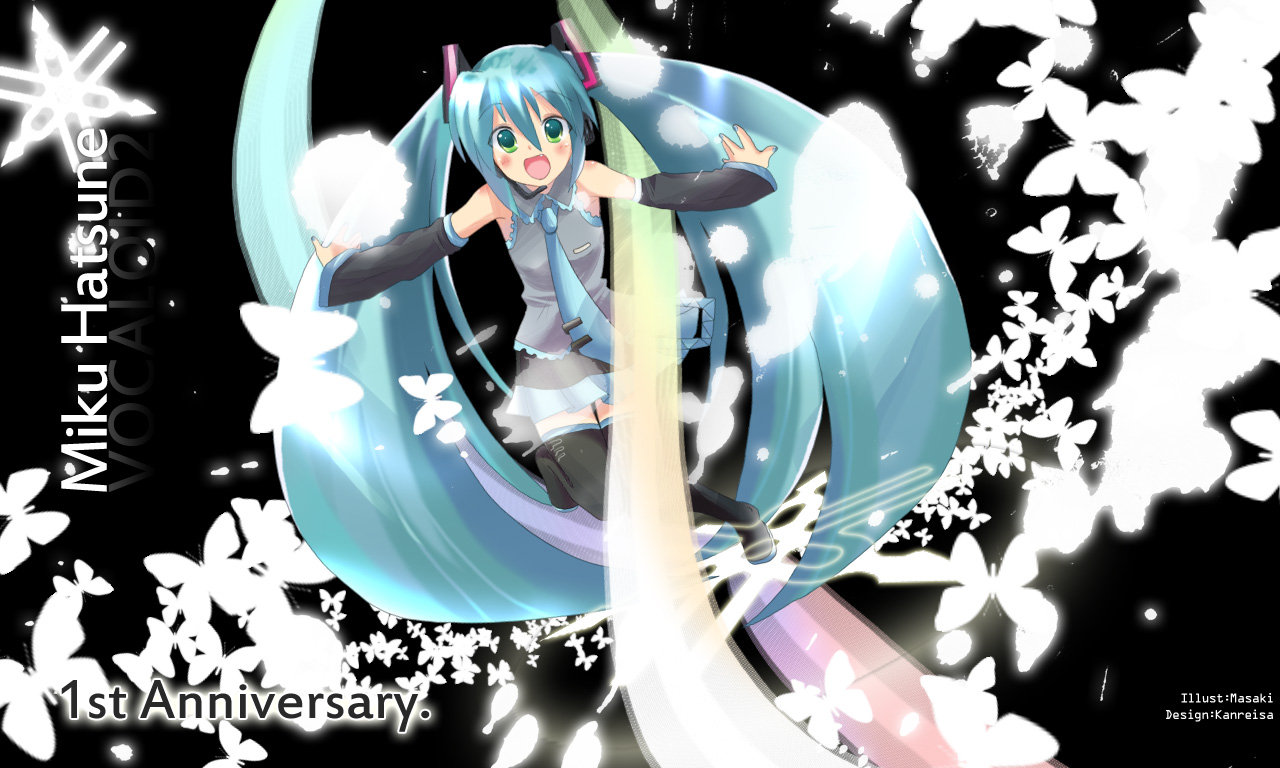 aqua hairblushbugbutterflydetached sleevesfanggreen eyesheadsetinsectlong hairnecktieskirtsolothighhighstwintailsvery long hair