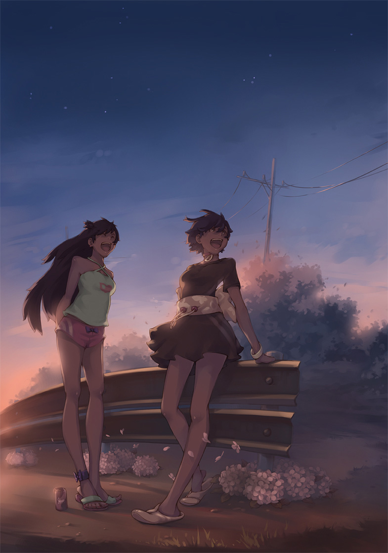 2girlsankle ribbonankletarms behind backbraceletcanclosed eyesdark skindark-skinned femaleeveningflowerguard railhalterneckhappyhydrangeajewelryleg ribbonlegbandlegslong hairmultiple girlsnecklacenightno socksopen mouthoutdoorspetalspower linesribbonsandalsshort hairshort shortsshortsskirtslipperssmiletank toputility polewind