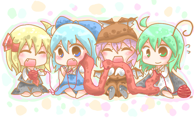 4girlsantennaebarefootblonde hairblue eyesblue hairblushbowcapechibiclosed eyesdressfangfemale focusgreen eyesgreen hairhair bowmultiple girlsopen mouthpurple hairred eyesscarfsewingshared clothesshared scarfteam 9 (touhou)yarnyarn ball
