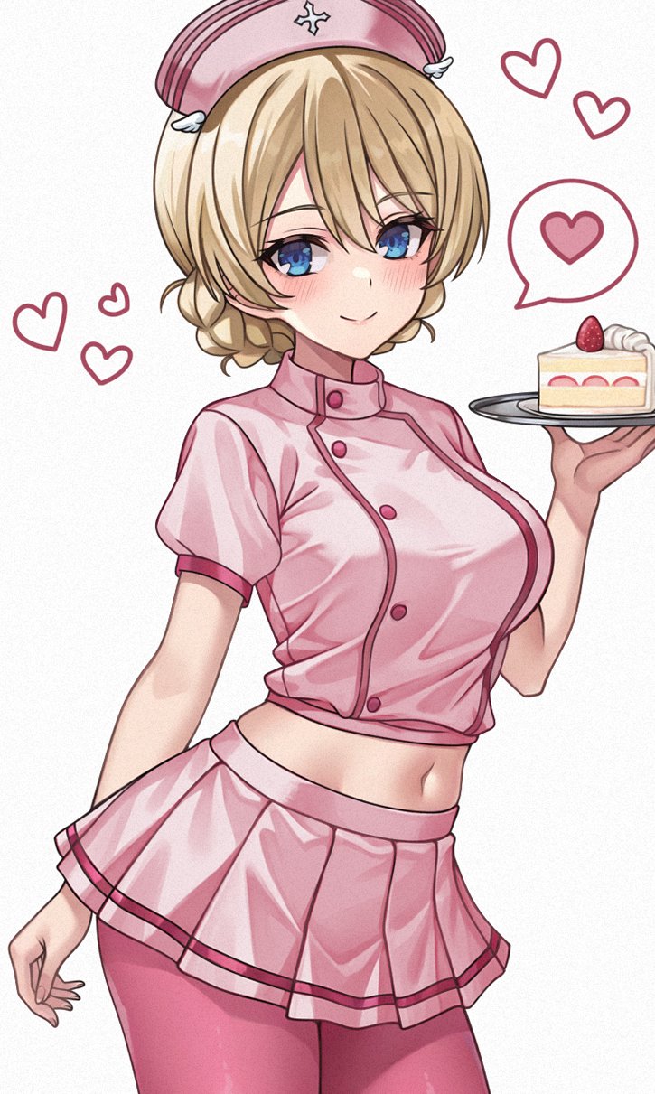 1girlalternate costumeblonde hairblue eyesblushbreastscakecake slicefeet out of framefoodheartholdinglarge breastslong hairlong sleeveslooking at viewernavelnursepantyhosepink pantyhosepink skirtsimple backgroundskirtsmilesolostandingwhite background