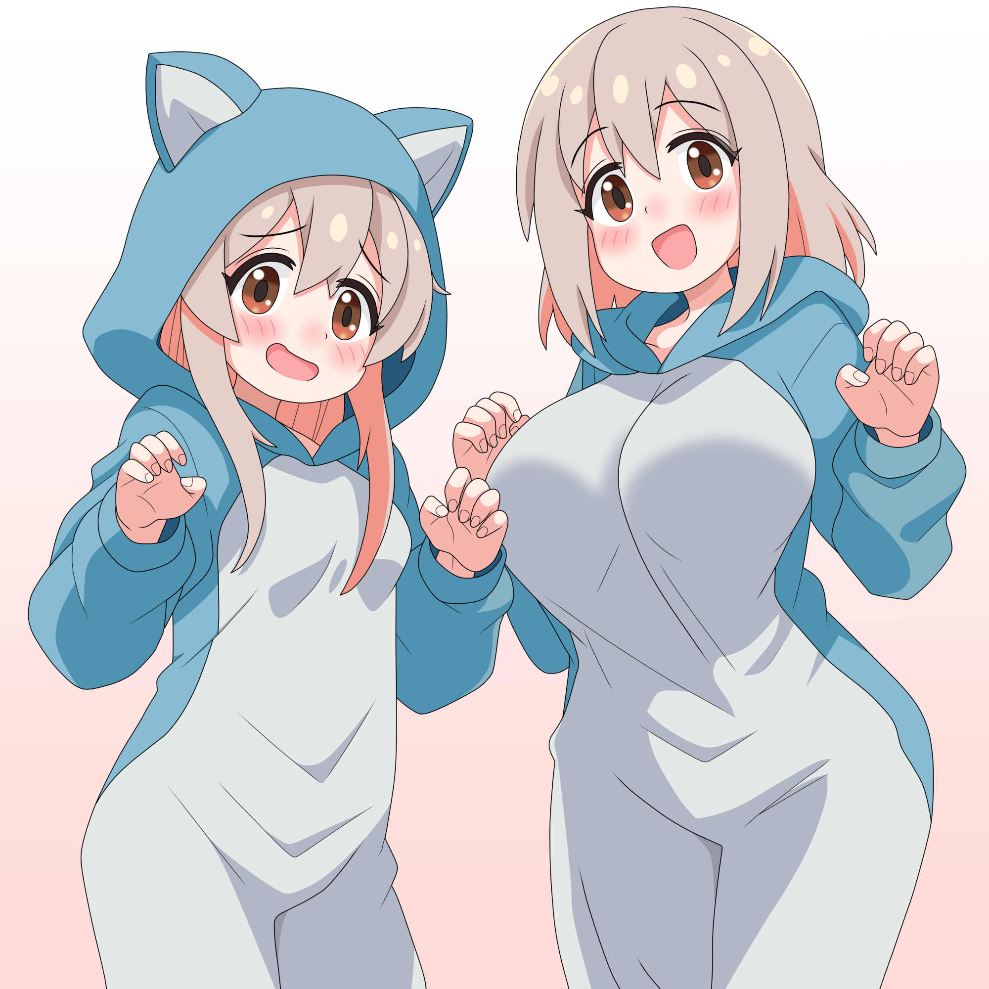:d2girlsanimal costumeblushbreastsclaw posecolored inner haircowboy shotgradient backgroundgrey hairhair between eyeshoodhood downhood uphuge breastslong hairlong sleeveslooking at viewermedium hairmother and daughtermulticolored hairmultiple girlsonesieopen mouthpajamaspink backgroundpink hairsidelockssimple backgroundsmall breastssmiletwo-tone hairwhite backgroundwolf costume