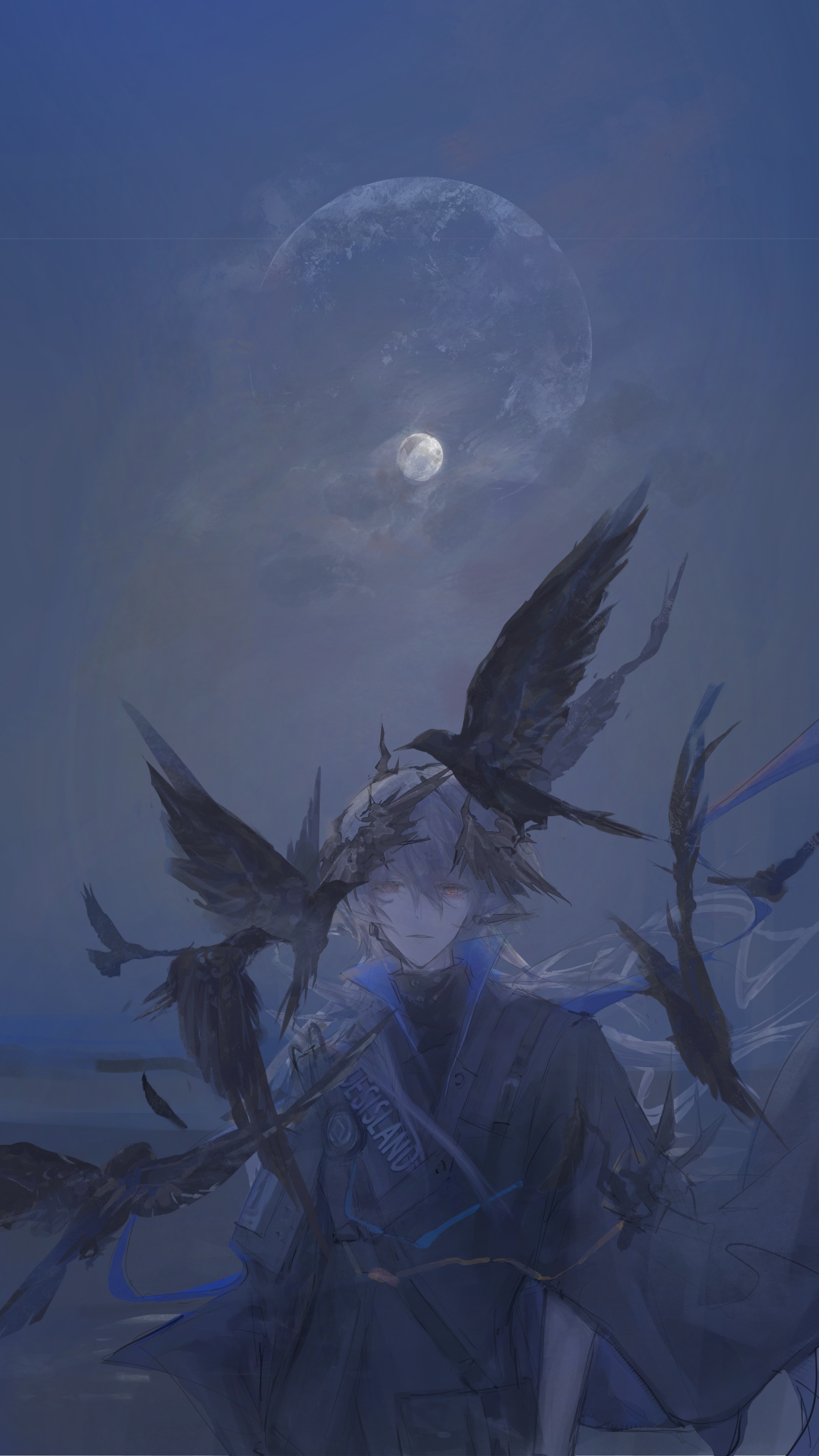 1boybirdblack jacketblack wingscrowempty eyesexpressionlessfeathered wingsfloating clothesfloating hairfull moongrey hairhair between eyeshead wingsjacketlong hairmale focusmolemole under eyemoonmultiple moonsnightnight skyred eyesskystraight-onturtleneckweichengnianbuluoliwide sleeveswings