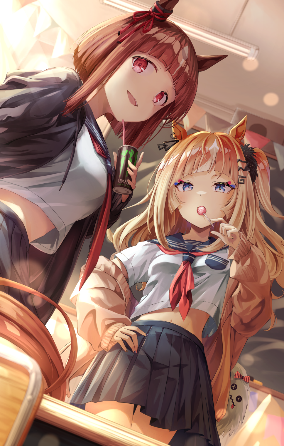 2girlsanimal earsblack skirtblue eyesbowbrown haircancandyear ribbonfoodholdingholding canholding candyholding foodholding lollipophorse earshorse girlhorse taillollipoplooking at viewermidriffmulticolored hairmultiple girlsneckerchiefopen mouthorange hairred eyesred neckerchiefred ribbonribbonschool uniformserafukushirtshort hairskirtsmilestreaked hairtailwhite shirt