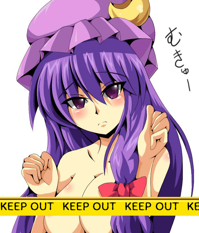 1girlblushbreastsbreasts squeezed togethercleavagecrescentcrescent hat ornamentfemale focushair ribbonhathat ornamentlong hairmedium breastsmukyuupurple hairribbonsolotopless female