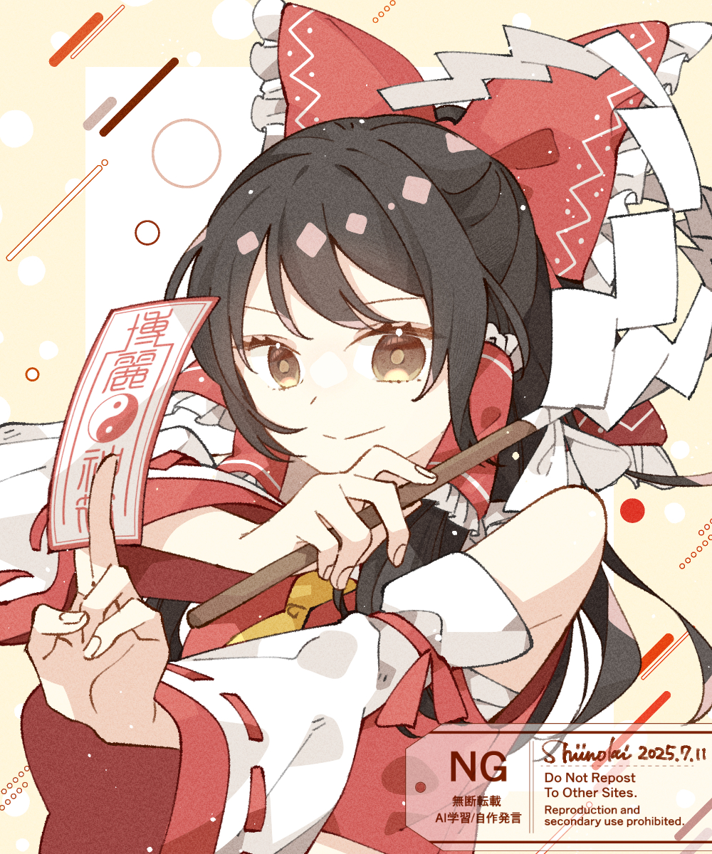 1girlblack hairbowbrown eyeschest sarashiclosed mouthdetached sleevesfrilled bowfrilled hair tubesfrillshair bowhair tubesholdinglong hairoutstretched armprint bowred bowred shirtribbon trimribbon-trimmed sleevessarashishiinoki eilshirtsleevelesssleeveless shirtsoloupper bodywhite sleeves