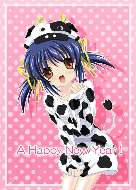 00s1girl2009animal printblue hairblushbrown eyescow printfemale focusnew yearorange eyesribbonshirtshort hairsolot-shirttwintails