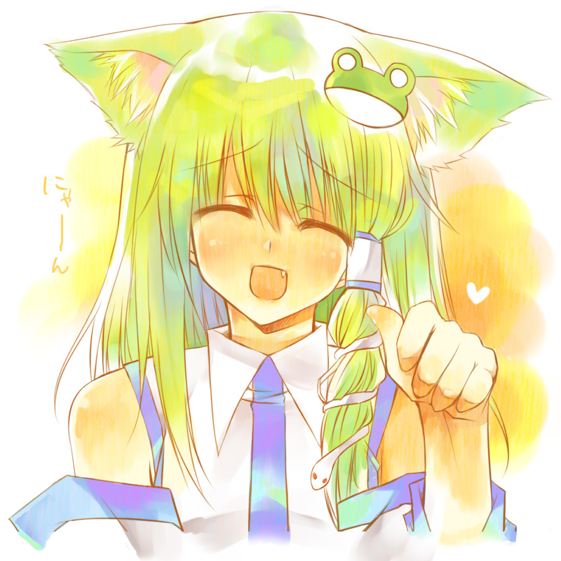 1girlanimal earsblushcat earscat girlclosed eyesfangfemale focusgreen hairheartkemonomimi modeopen mouthpaw poseportraitsolo