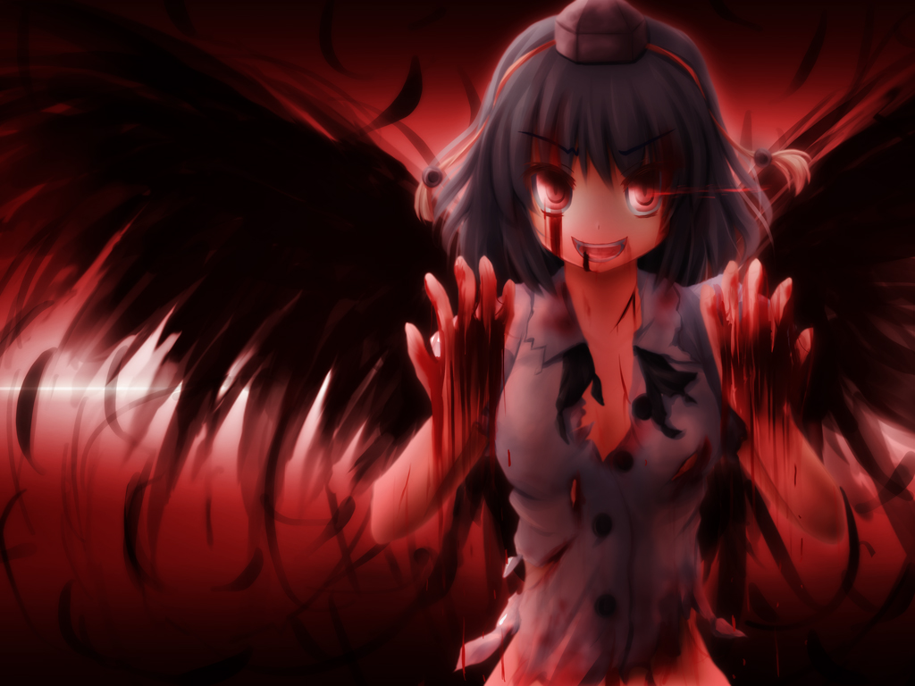 1girlblack hairblack wingsbloodcutsfeathersfemale focusgrinhatinjurylooking at vieweropen mouthred eyesshort hairsmilesolotorn clotheswingsyandere