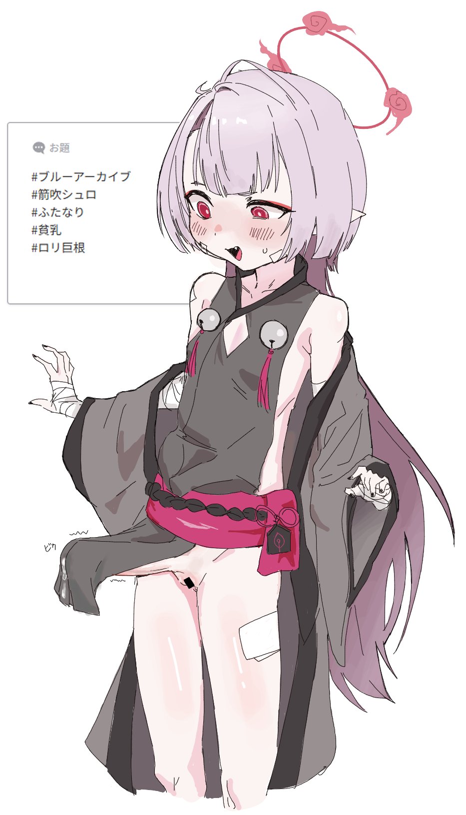 1girlbandaged armbandagesbare shouldersbellblack nailsbulgecropped legserectionerection under clothesfangfutanarigrey hairhalojingle belllong hairlong sleevesopen mouthpenispenis peekpointy earsprecumprecum through clothesred eyesred halosimple backgroundsolowhite backgroundwide sleeves