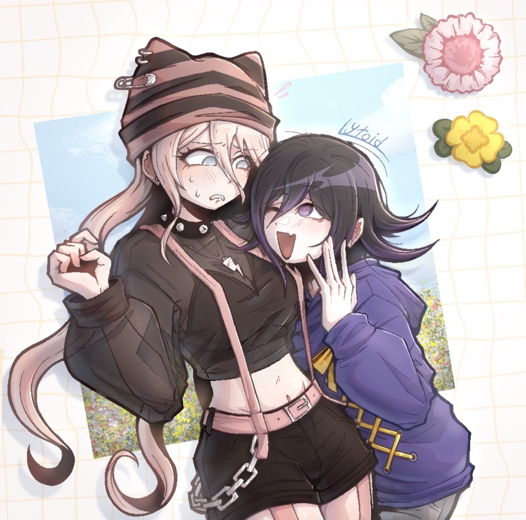 1boy1girlanimal hatartist namebeltblack hairblack shortsblonde hairblue eyesblushcat hatcollarcropped shirteyelashesfangflipped hairflowergrid backgroundhair between eyeshatheight differenceheterohoodhoodielong hairlong sleevesmedium hairnavelone eye closedopen mouthpink beltpurple eyespurple hairpurple hoodiesee-through clothessee-through shirtshirtshortsshyskin fangsmilespiked collarspikessports brasuspendersvery long hair