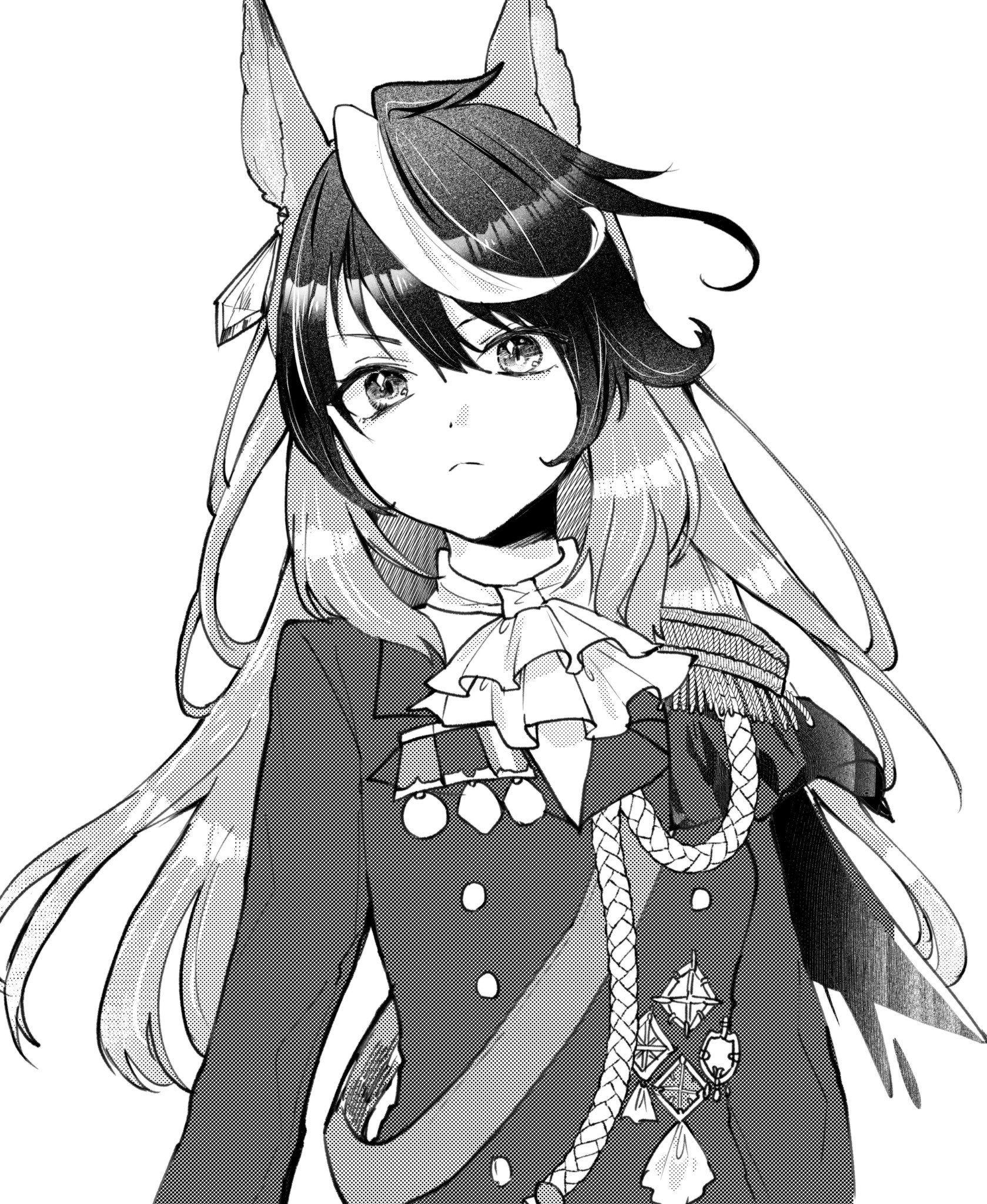1girlaiguilletteanimal earsascotcapeclosed mouthear ornamentearringsepauletteshair between eyeshorse earshorse girljacketjewelrylong hairlong sleeveslooking at viewermedalmonochromemulticolored hairside capesimple backgroundsingle earringsingle epaulettestreaked hairupper bodywhite background