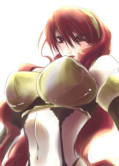 breastsheadbandhigh-cut armor (persona)huge breastslingerielipsticklong hairmakeupred eyesred hairunderwearwavy hair