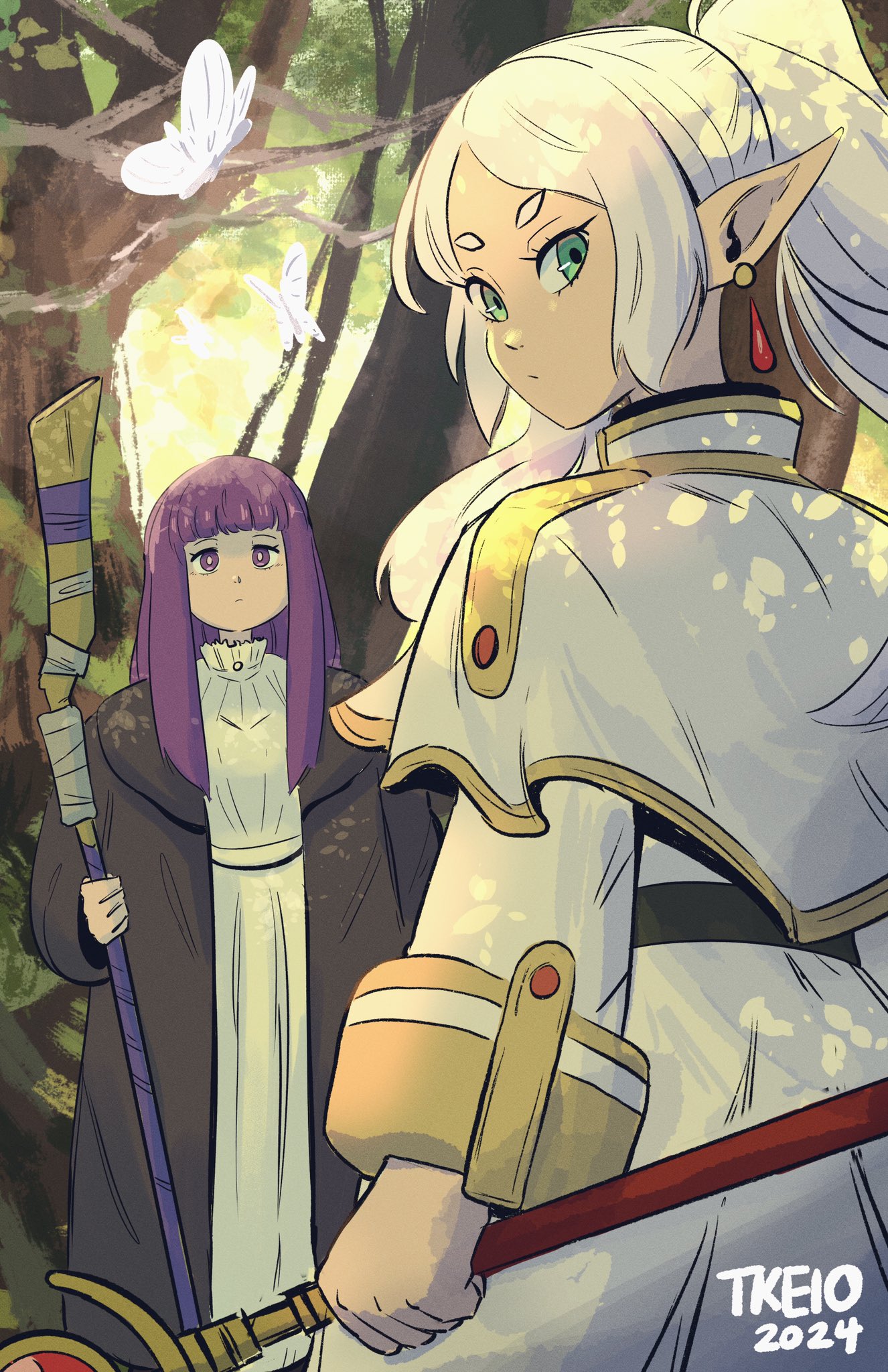 2girlsblack coatbugbutterflycapeletclosed mouthcoatdateddaydot mouthdressearringselfforestgreen eyesholdingholding staffinsectjewelrylong hairlooking at viewerlooking backmultiple girlsnatureoutdoorspointy earspurple eyespurple hairshirtskirtstaffstriped clothesstriped shirttreetwintailswhite capeletwhite dresswhite hairwhite skirt